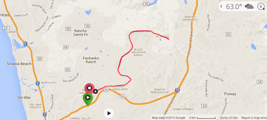 The first LPP track of our performance testing is a 20 mile segment that has a variety of terrain that adds approximately 1,100 feet of vertical ascent. The track is in North San Diego. It starts at the Intersection of Carmel Valley Road and I-56, follows Carmel Valley Road to Camino Del Sur. The track continues on Camino Del Sur as it changes name to Camino del Norte on the intersection of Rancho Bernardo Road. The track now continues on Camino del Norte until it loops back on the intersection of Camino San Bernardo. For the first 10 miles, the Pro Test Rider is mostly ascending with a maximum gradient of 5.5% prior to the intersection of Carmel Valley Road and Camino del Sur. The returning 10 miles are mostly descending , yet there is rolling terrain as well as two longish ascent efforts. The maximum ascent gradient on the way back is 6.5%.
